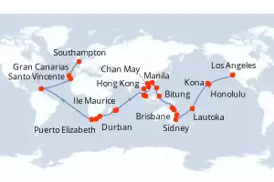 Itinerario : Los Angeles, Kona, Honolulu, date, Lautoka, Sidney, Brisbane, Airlie Beach, Yorkeys Knob, Bitung, Manila, Hong Kong, Baia de Halong, Chan May, Laem Chabang, Singapur, Port Kelang, Ile Maurice, Isla de la Reunion, Durban, Puerto Elizabeth, Ciudad del Cabo, Santo Vincente, Gran Canarias, Madeira, Southampton