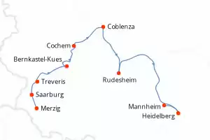 Itinerario : Merzig, Saarburg, Treveris, Bernkastel-Kues, Cochem, Coblenza, Rudesheim, Heidelberg, Mannheim