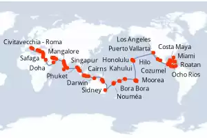 Itinerario : Miami, Cozumel, Costa Maya, Belize (harvest caye), Roatan, Gran Caiman, Ocho Rios, Puerto Limon, Cartagena de Indias, Panama city, Puntarenas, Acajutla, Puerto Quetzal, Puerto Vallarta, Cabo san Lucas, Los Angeles, Honolulu, Kahului, Hilo, Bora Bora, Moorea, Papeete, Moorea, Huahine, Raiatea, Bora Bora, Pago Pago, Apia, Suva, Lautoka, Mystery Island, Lifou, Nouméa, Sidney, Townsville, Cairns, Cooktown, Darwin, Komodo, Benoa, Surabaya, Semarang, Singapur, Port Kelang, Penang, Phuket, Colombo, Male, Cochin, Mangalore, Goa, Mumbai, Muscat, Dubai, Doha, Abu Dhabi, Salaalah, Djedda, Safaga, Aqaba, Haifa, Limassol, Rodas, Kusadasi, El Pireo Atenas, Sorrento, Civitavecchia - Roma
