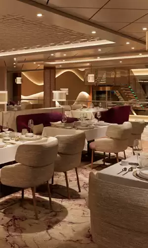 Concebido como un gran resort flotante, el barco AROYA se distribuye en varias cubiertas y ofrece numerosos camarotes y suites luminosos —muchos de ellos con balcón— que funcionan como auténticos refugios privados entre escalas. Los espacios comunes son amplios: salones panorámicos, un gran teatro, zona acuática con toboganes, clubes para niños y adolescentes, un centro de bienestar y completas instalaciones deportivas. La tripulación, siempre atenta y presente, te acompaña durante todo el viaje para que tu experiencia sea fluida y cómoda. Para quienes buscan aún más exclusividad, el área Khuzama reúne suites premium con servicios personalizados (mayordomo, embarque prioritario, restaurante y lounge privado), aportando un nivel más alto de refinamiento a la experiencia AROYA.