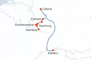 Itinerario : Colonia, Cochem, Bernkastel-Kues, Saarburg, Saarlouis, Grevenmacher, Trèves, Koblenz, Colonia