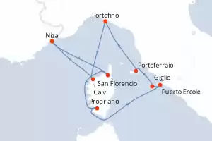Itinerario : Niza, San Florencio, Propriano, Puerto Ercole, Giglio, Portoferraio, Portofino, Calvi, Niza