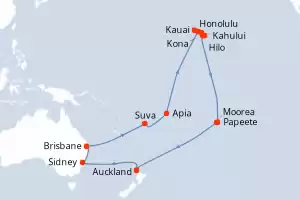 Itinerario : Auckland, Sidney, Brisbane, Suva, Apia, Honolulu, Kauai, Kahului, Hilo, Kona, Papeete, Moorea, Auckland