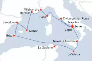 Itinerario : Civitavecchia - Roma, Nápoles, Capri, Calvi, Villefranche, Marsella, Mahon, Barcelona, Ibiza, La Goulette, La Valetta, Naxos Di Giardini, Sorrento, Civitavecchia - Roma