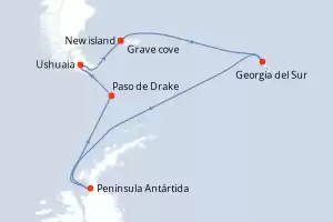 Itinerario : Ushuaia, Isla de Goicoechea, Grave cove, Georgia del Sur, Peninsula Antártida, Paso de Drake, Ushuaia